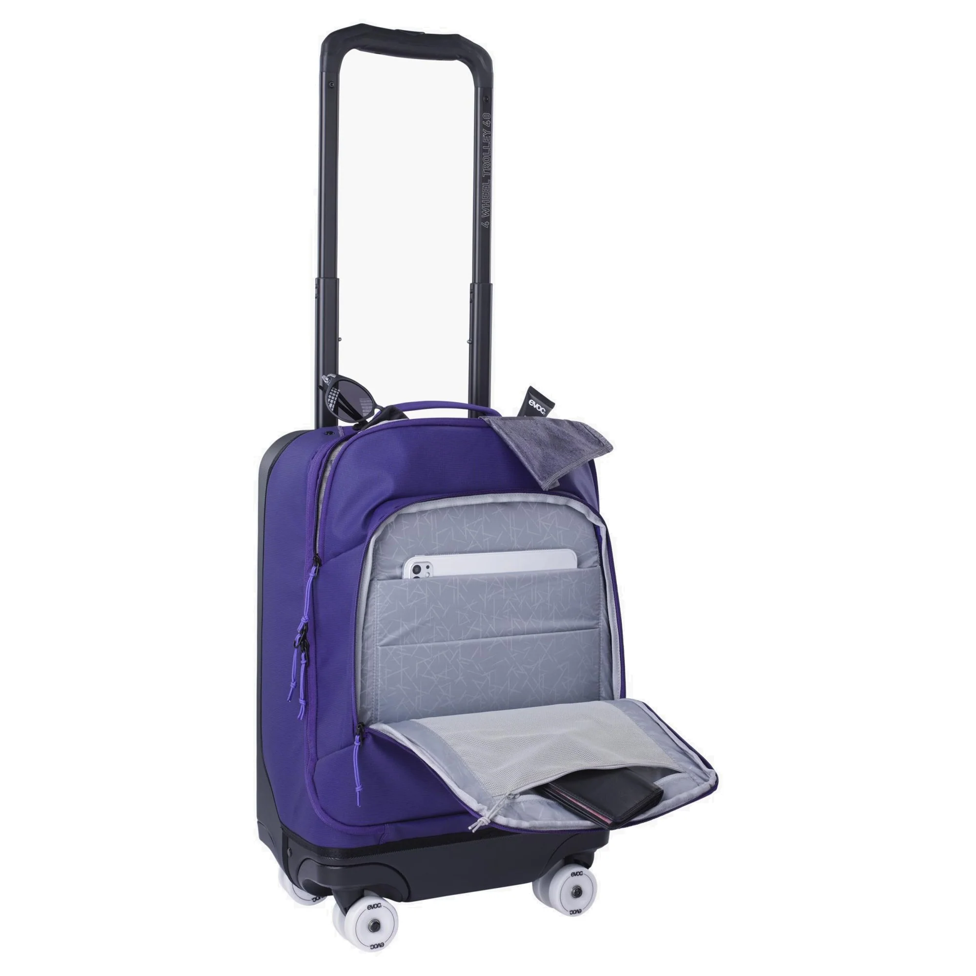 Der EVOC 4-Wheel Trolley 40 ist ein kompakter Kabinentrolley in der Farbe violet-black, der durch sein hybrides Design aus Koffer und Tasche überzeugt. Mit einer Höhe von 56 cm und einem Volumen von 40 Litern bietet er ausreichend Platz für Geschäfts- und Kurzreisen.