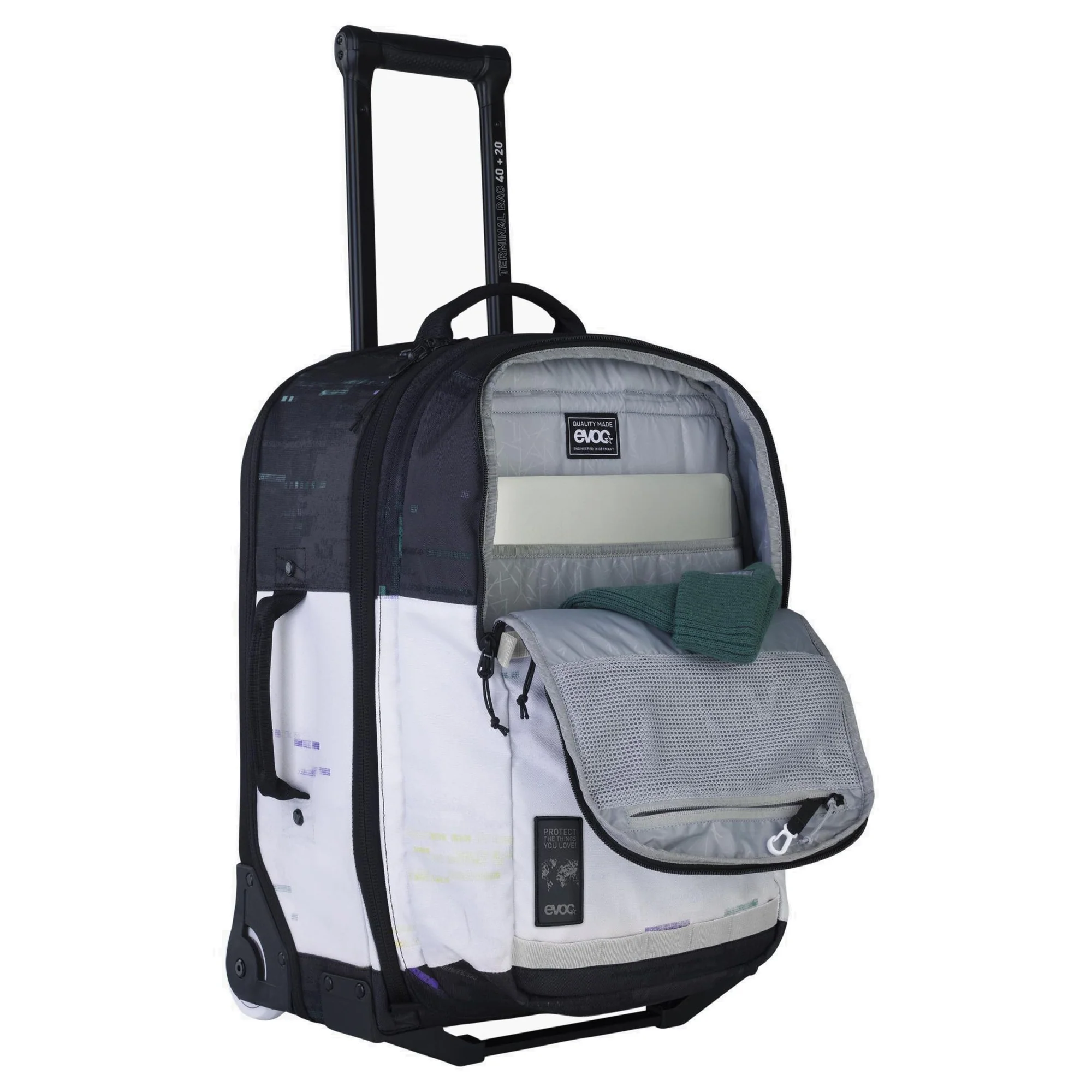 Der Evoc Terminal Bag 40+20 ist eine funktional gestaltete Rollenreisetasche, die sich durch ihr durchdachtes Design besonders für Flugreisen im Handgepäckformat eignet. Die Kombination aus Trolley und abnehmbarem Tagesrucksack bietet flexible Transportmöglichkeiten und erleichtert das Reisen erheblich.